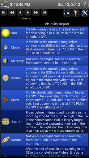 This app is fantastic if you’re an astronomer. I think even professional astronomers would like it. It provides more than a chart of numbers and times, it also provides general overview information about an objects you want to focus on. It’s like having an encyclopedia of the skies in your hands.