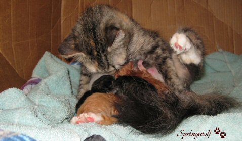 The final male is the smallest of the 4. His delivery was quick and came within moments of the 3rd. But he wasn’t breathing upon delivery and she didn’t seem to pay him any attention. Luckily we were able to remove the embryonic sack and rubbed him with a paper-towel to dry him off and get some massage going on his chest. Then with a healthy cough and wiggle he gasped for air and started breathing. Yeah! The two males are orange, like their older brother Meep, who has become my best buddy.