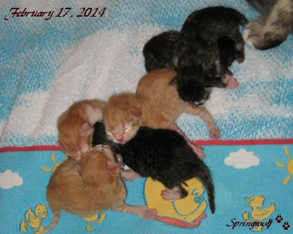It seems our baby count was a bit premature. Mom has provide an additional number to the litter of now 6 kittens. 3 Orange, and 3 Black. OMG!