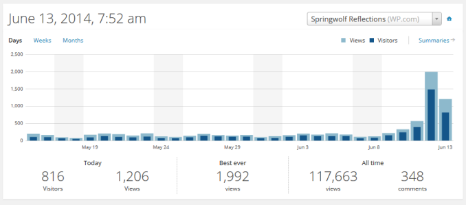 Admittedly, I’ve posted the heck out of this month’s special event. Well, it’s special. I have a math wiz looking at the numbers for me. How often does a full moon fall on Friday? How often does a full moon fall on the 13th? How often does a full moon fall on Friday the 13th. You can imagine how rare this event really is. So when I received notification this afternoon (06/12/2014) that my stats are skyrocketing, I had to take a look. The day isn’t over yet.