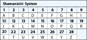 Looking over your Shamanistic System alpha-numeric chart, I first noticed that your alphabet went up to 28, and wondered why. I see that the numbers 11 and 21 are missing from the chart. Is there a reason for that?